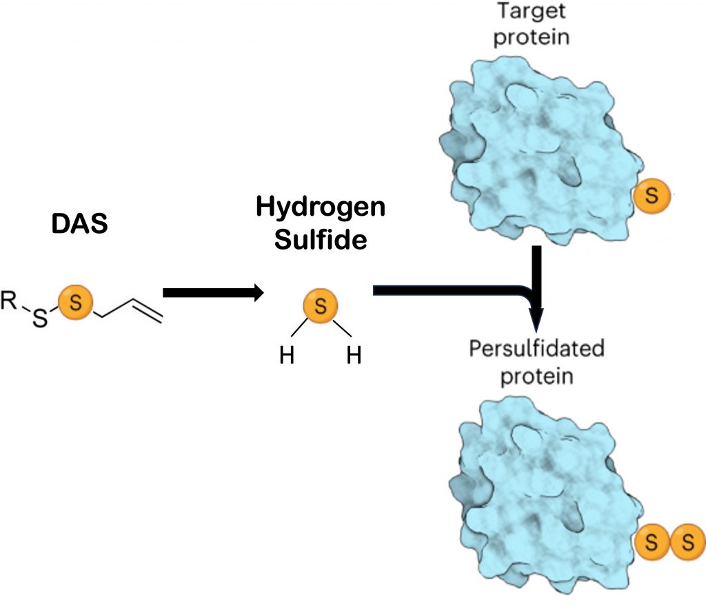 Proteins can change their formation when certain molecules attach to them (post-translational modifications). These attachments are like an on/off switch that alters the activity or function of a protein. For example, when a sulfur atom is attached to a protein—a process called protein persulfidation—the protein changes shape and switches functions. While protein persulfidation occurs naturally, it can be triggered by sulfur-enriched molecules like DAS. DAS has been shown to generate hydrogen sulfide (H2S), which then donates a sulfur to certain proteins.