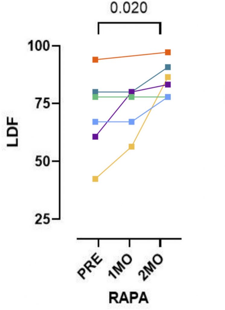 Due to events unrelated to the study, one of the participants could not complete the LDF experiment. Still, the results showed an increase in blood flow after eight weeks of rapamycin treatment in all five remaining participants. These findings suggest that rapamycin treatment counteracts blood vessel stiffening, one of the most dangerous symptoms of vascular aging. It follows that rapamycin could potentially reduce the risk of cardiovascular-related death.