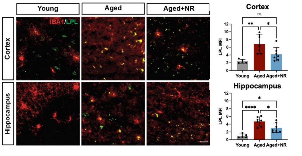 As with the activated microglia experiments, lipid metabolism was measured from the cortex and hippocampus of the brain. In the cortex, NR supplementation restored lipid metabolism to youthful levels. In the hippocampus, lipid metabolism was nearly cut in half. In both cases, lipid metabolism was significantly reduced, demonstrating that NR mitigates the metabolic defects associated with activated microglia.