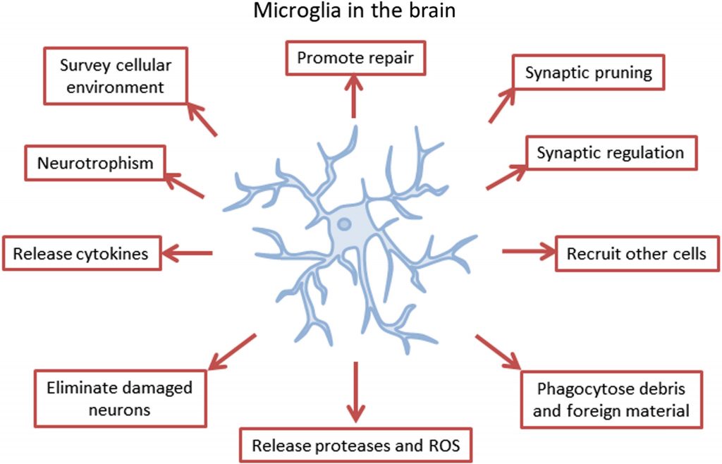 Microglia are fully motile immune cells that surveil the brain for pathogens, cellular debris, and damaged neurons. They are capable of destroying debris and foreign material through a process called phagocytosis and can eliminate damaged neurons. They also play a critical role in cognitive health by removing weak or unused neuronal connections in a process called synaptic pruning. Essentially, microglia keep the brain running efficiently.