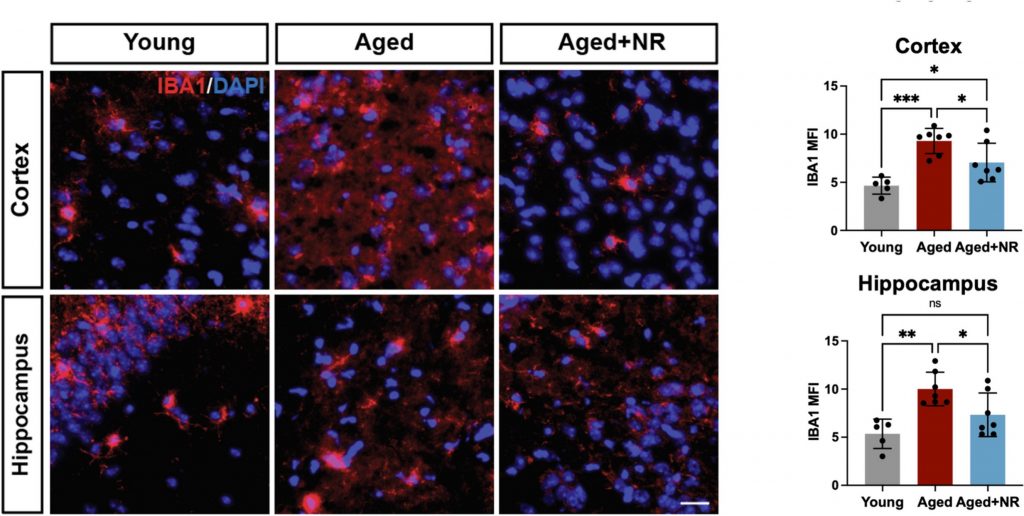 Microglia are like Dr. Jekyll and Mr. Hyde cells. Ordinary microglia are beneficial and essential for brain health, whereas so-called activated microglia are harmful and promote neuroinflammation and cognitive impairment. The Kansas researchers observed that aged mice have more activated microglia in their brains than young mice. However, NR supplementation lessened the threat of these pro-inflammatory cells.
