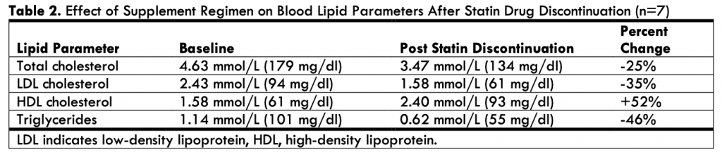 After 16 weeks, the seven participants who were taking statins were able to discontinue use. They exhibited a 25% reduction in total cholesterol, a 35% reduction in LDL cholesterol, a 46% reduction in triglycerides, and a 52% increase in HDL cholesterol. Some participants experienced flushing, upset stomach, or liver damage, as determined by high AST (aspartate aminotransferase) and ALT (alanine aminotransferase) levels. The patients with liver damage were told to go off NA until AST and ALT levels went back to normal and resume (lower) maintenance doses. Aspirin was given to participants to reduce flushing.