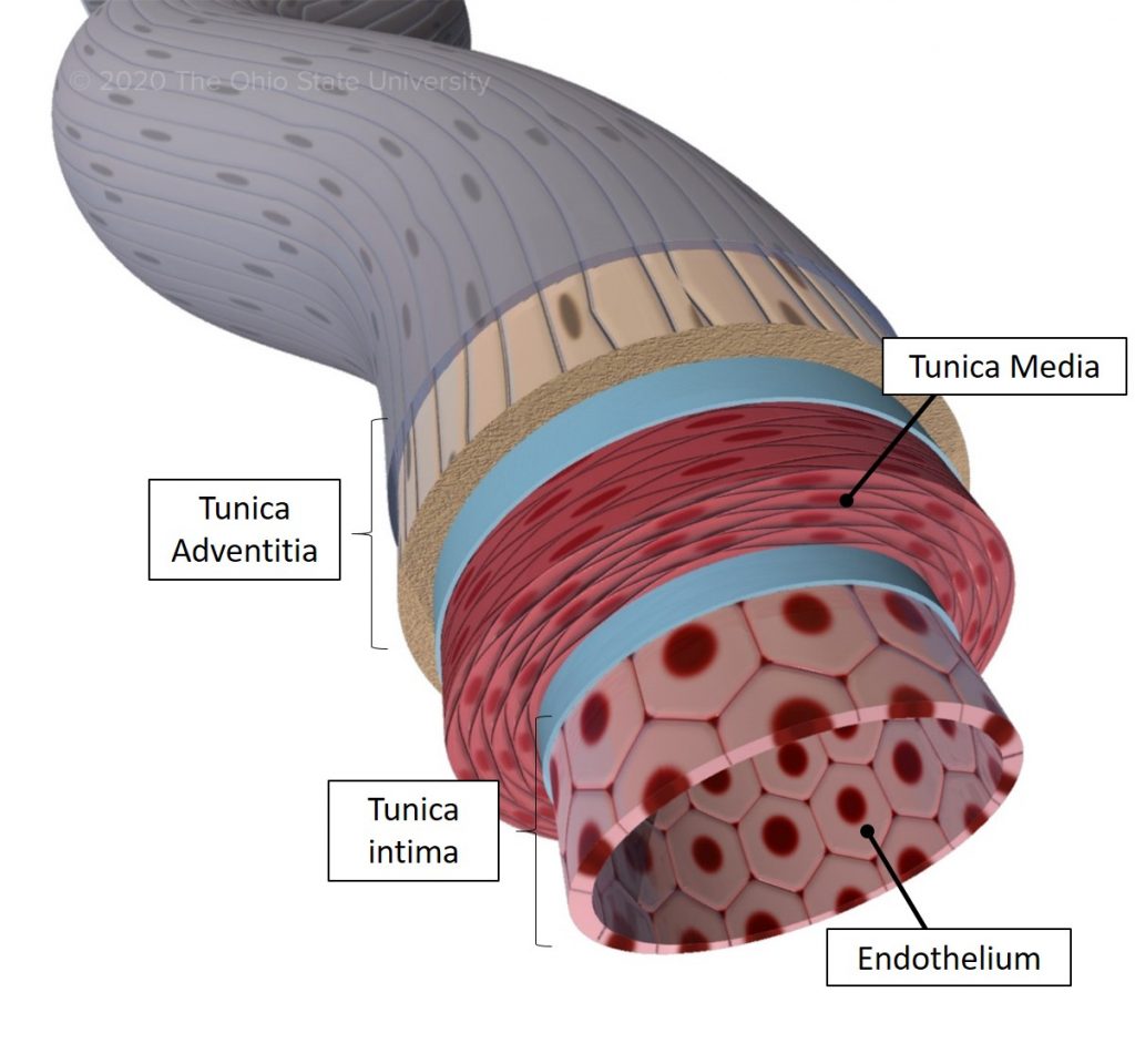 Our blood vessels, particularly our arteries and veins, are composed of three structural layers. The middle layer, called the tunica media, contains muscles that control the flow of blood. However, with age, the tunica media becomes thicker and more fibrous, leading to blood vessel stiffness. Blood vessel stiffness is a serious condition that can promote the development of heart disease, which is the leading cause of death.