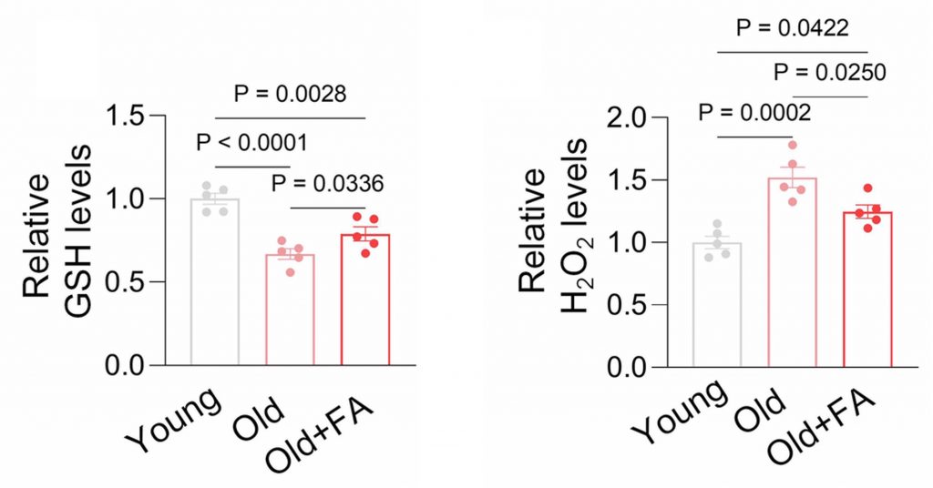 Remarkably, compared to old mice that drank ordinary water, the FA-treated old mice exhibited higher levels of the “master antioxidant” glutathione. Glutathione is the most abundant natural antioxidant in our body. It directly neutralizes ROS, such as hydrogen peroxide, one of the most pervasive of its kind. Indeed, FA-treated old mice exhibited a significant reduction in hydrogen peroxide, suggesting FA reduces ROS by increasing glutathione.