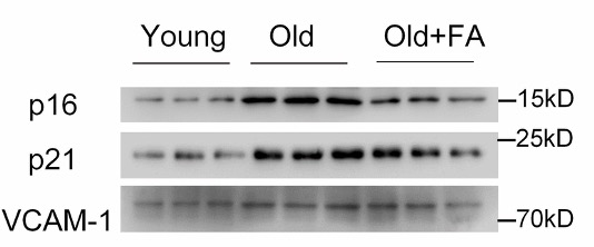 Strikingly, FA treatment was shown to reduce cell senescence, as indicated by reduced p21, p16, and VCAM-1 protein levels in the blood vessels of old mice. Moreover, FA-treated old mice exhibited a significant reduction in mRNA levels for molecules secreted by senescent cells. These findings suggest that FA combats cell senescence by preventing the accumulation of senescent cells, thereby reducing the age-promoting molecules they secrete.