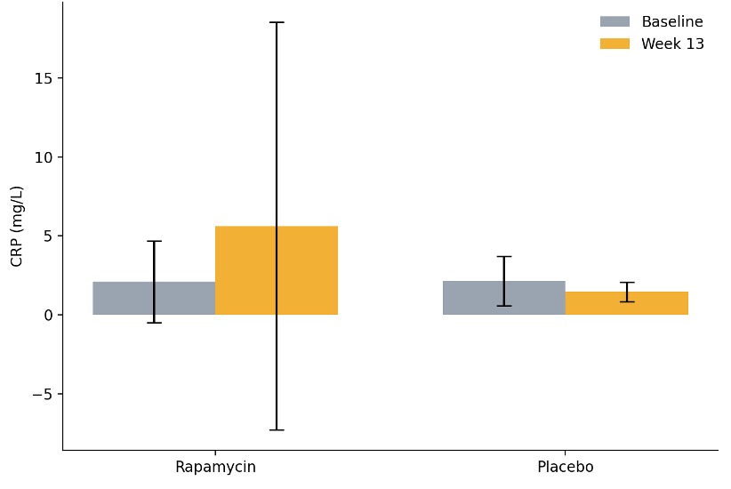 - A marker for inflammation, C-reactive protein (CRP), was elevated in rapamycin users, but this was mainly due to two participants having exceptionally high levels.