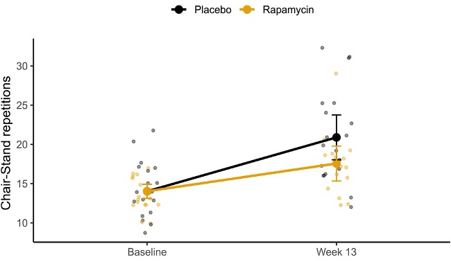 - Rapamycin reduces the number of times older adults can stand up from and sit down in a chair within 30 seconds.