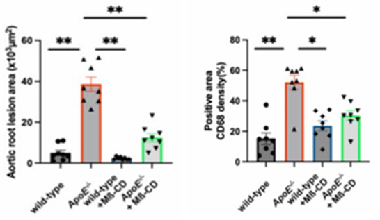 Researchers fed ApoE−/− mice (a standard model for atherosclerosis) a high-fat diet for 12 weeks. As expected, the animals developed large plaques in their aorta. But when treated twice weekly with Mß-CD, the plaque area shrank by more than half, from nearly 20% of the aorta to just 8%.