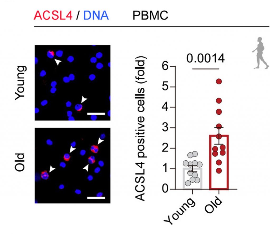 Through a series of experiments, the researchers linked the ferroptosis pathway to aging. They observed that iron levels increased with age in multiple human tissues, including the heart and muscle. They also examined a key enzyme in the ferroptosis pathway, known as ACSL4, which facilitates the incorporation of lipids into cell membranes. In immune cells from older adults, they found increased lipid damage and higher levels of ACSL4.